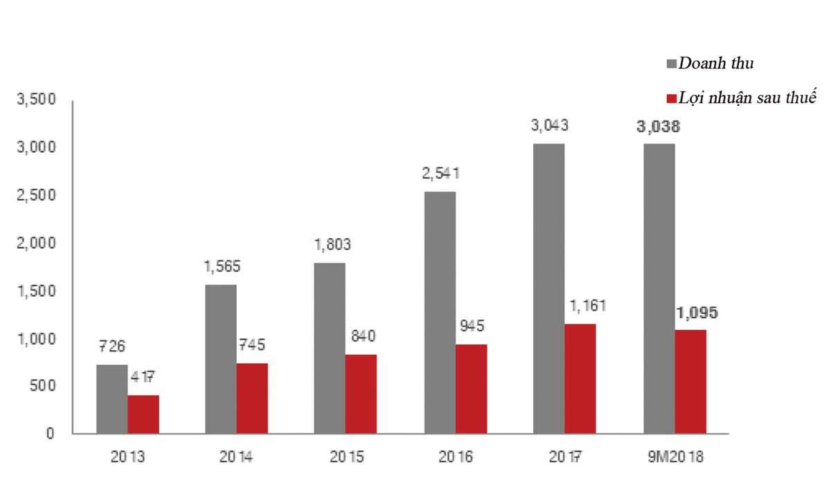 Doanh thu và lợi nhuận sau thuế của SSI giai đoạn 2013 - 9T/2018.
