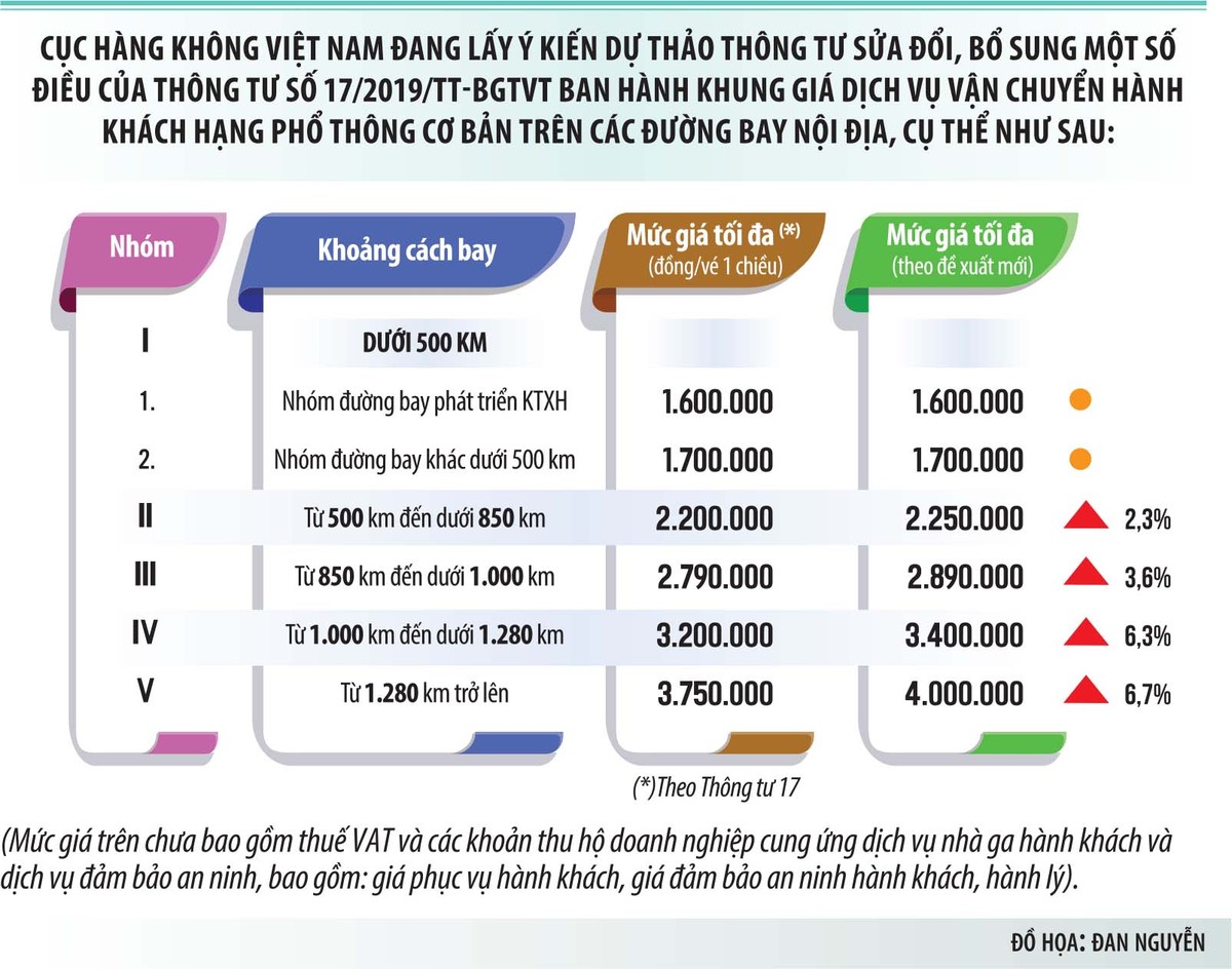 Sau khi rà soát, Bộ GTVT kiến nghị sửa đổi quy định chi tiết hơn với danh mục này theo hướng: “Dịch vụ vận chuyển hành khách hàng không nội địa hạng phổ thông cơ bản” do Bộ GTVT định giá tối đa.