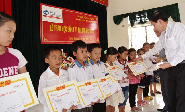 Tổng Biên tập Báo Đầu tư Nguyễn Anh Tuấn, Trưởng ban tổ chức Giải Golf “Vì trẻ em Việt Nam” trao học bổng cho các em học sinh huyện Hương Khê (Hà Tĩnh)