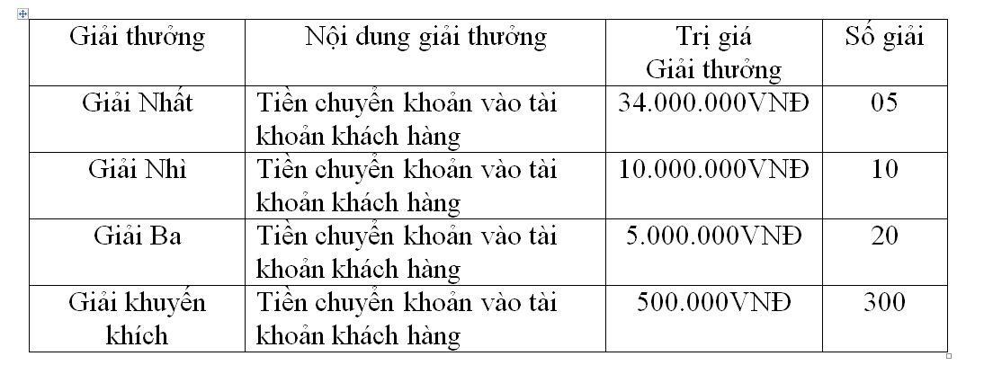 Mỗi giao dịch của khách hàng thời gian diễn ra chương trình sẽ nhận 1 mã trúng thưởng để có cơ hội được quay số trúng thưởng 369 giải thưởng với tổng giá trị 622 triệu đồng. Agribank không hạn chế số lần giao dịch của khách hàng trong mỗi đợt quay số trúng thưởng, khách hàng giao dịch càng nhiều, cơ hội trúng thưởng càng lớn.