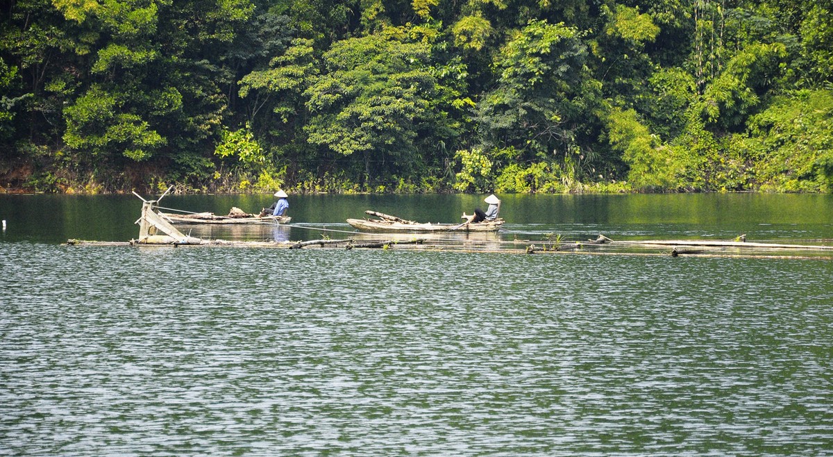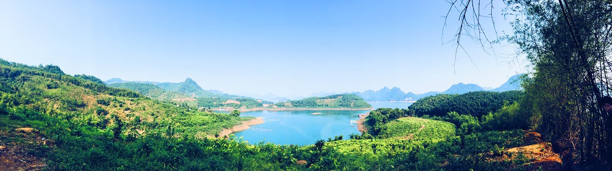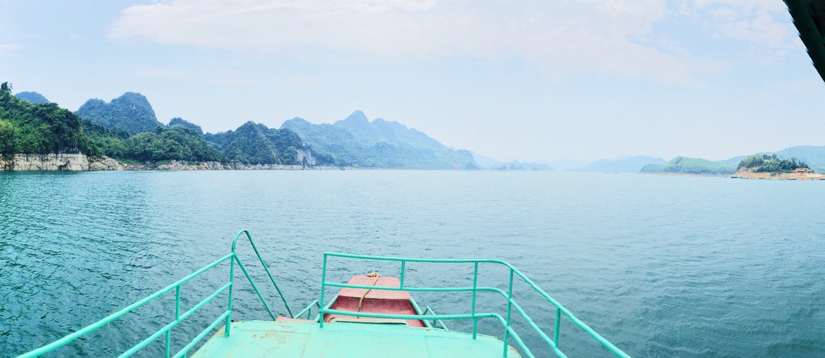 Vừa qua Xuân, chớm Hè, trời trong, nắng nhẹ, mặt hồ trong xanh in dáng núi non trùng điệp. Thỉnh thoảng giữa dòng lại nhô lên vài thân cây khẳng khiu nghiêng mình soi bóng. Những sườn núi hai bên trông như bức tranh ai đó vẽ vội, chỉ mới kịp phết lên đó mảng xanh sẫm không đều màu từ lá rừng. Cảm giác như mây trời, đồi núi và mặt hồ được nối liền với nhau bằng một màu xanh bất tận giữa sông nước mênh mông.