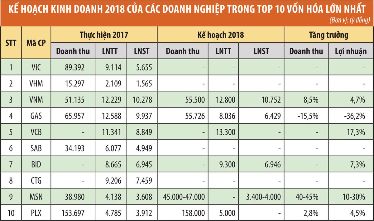 Trong Top 10 doanh nghiệp vốn hóa lớn nhất HOSE, ngoại trừ VIC dự kiến sẽ tổ chức Đại hội đồng cổ đông (ĐHCĐ) trong nửa đầu tháng 6/2018, VHM chưa có kế hoạch do mới hoàn tất IPO và niêm yết, trong khi SAB vẫn đang trong quá trình tái cơ cấu tổ chức sau khi Thaibev sở hữu chi phối và xin lùi thời hạn tổ chức ĐHCĐ đến 30/6/2018, thì 7 công ty còn lại đều đã hoàn tất việc tổ chức ĐHCĐ thường niên 2018.