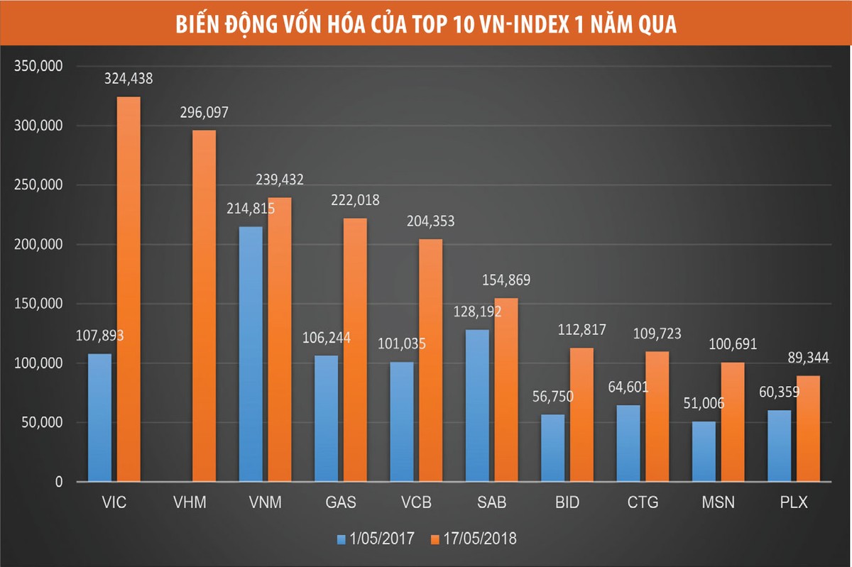 Như vậy, tại thời điểm đầu tháng 5/2017, vốn hóa của 10 cổ phiếu lớn nhất đạt 974.760 tỷ đồng, chiếm 51,47% tổng vốn hóa HOSE, thì đến 18/5/2018, với sự xuất hiện của VHM cũng như sự bứt phá của VIC, con số này đã tăng lên 1.853.700 tỷ đồng, tức tăng trưởng khoảng 90%, vượt qua tốc độ tăng trưởng vốn hóa toàn sàn.