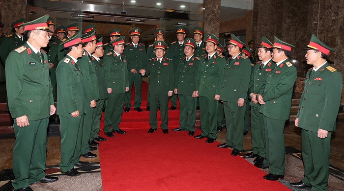 Đại tướng Ngô Xuân Lịch trao đổi cùng các đại biểu và cán bộ, lãnh đạo Quân khu 1. Ảnh BQP.