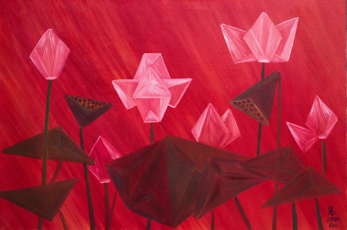 Một bức tranh hoa sen được trưng bày tại triển lãm. |