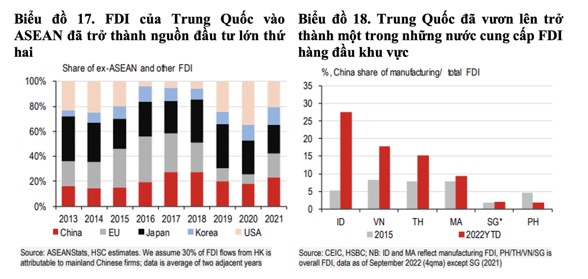 Báo cáo nhận định: "Nếu chúng ta nhìn vào lĩnh vực sản xuất, Indonesia, Việt Nam và Thái Lan đã chứng kiến sự gia tăng mạnh về tỷ trọng FDI từ Trung Quốc, vốn trước đây tập trung đầu tư nhiều vào bất động sản. Mặc dù quá trình này bị gián đoạn một phần do đại dịch, nhưng sau khi mở cửa trở lại, việc thúc đẩy đầu tư của Trung Quốc vào ASEAN sẽ tiếp tục phát triển mạnh".