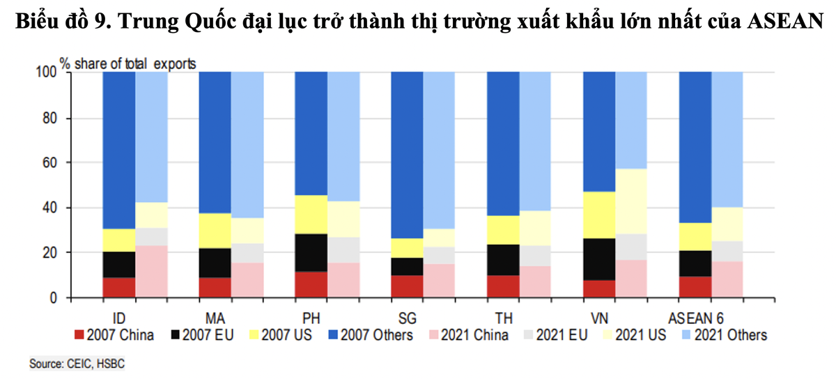HSBC đã đưa ra một “bức tranh đa chiều” về tình hình xuất khẩu của ASEAN sang Trung Quốc trong năm 2022, với sự dẫn đầu là Indonesia, nước có xuất khẩu đã phục hồi toàn lực, tiếp theo là Việt Nam và Malaysia. Tuy nhiên, tại Singapore, Thái Lan và Philippines lại đi theo chiều hướng ngược lại, với xuất khẩu giảm tới 30% so với cùng kỳ trong hầu hết nửa sau năm 2022.