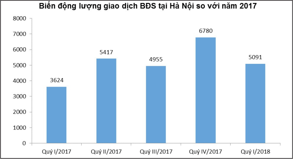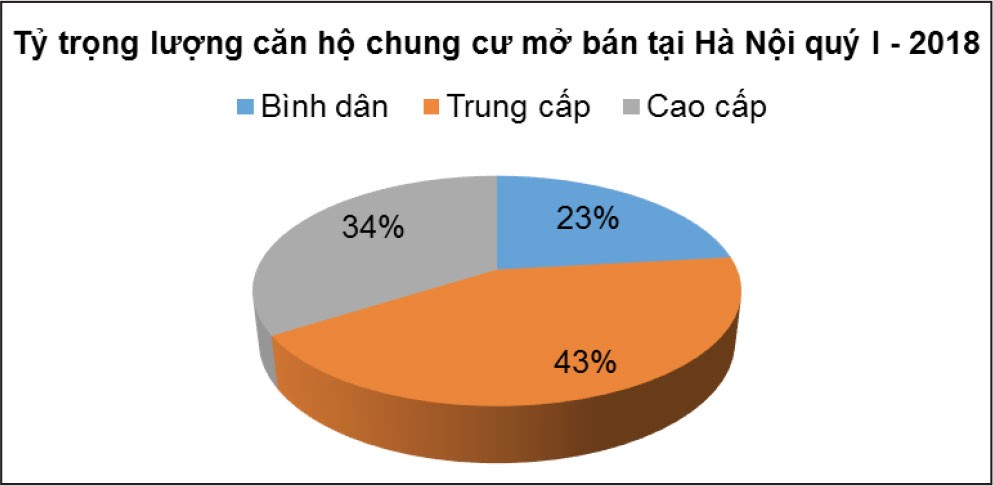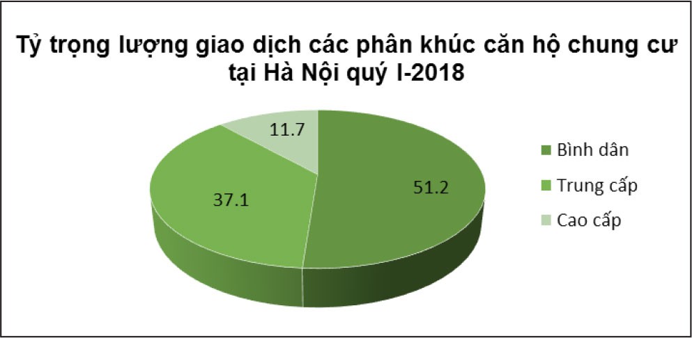 Sức cầu bền vững được thể hiện ngay trong quý đầu tiên của năm 2018 khi phân khúc chung cư bùng nổ trở lại, đặc biệt là sản phẩm nhà vừa túi tiền. Báo cáo mới nhất của Hội Môi giới bất động sản Việt Nam cho thấy, nếu như lượng sản phẩm chào bán mới tại Hà Nội duy trì ổn định như cùng kỳ năm trước ở mức 6.148 căn hộ, thì lượng thanh khoản cũng đạt tới gần 5.091 giao dịch. Mặc dù giảm so với quý liền kề, nhưng so với cùng kỳ năm 2017, thanh khoản tăng tới 1.467 giao dịch, tương đương với mức tăng 40,5%.