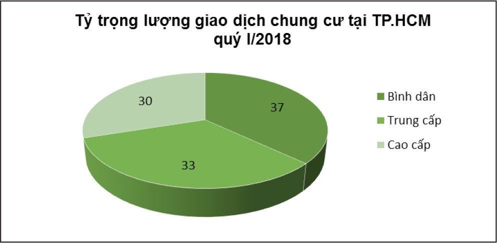 Trong đó, lượng giao dịch căn hộ chung cư cao cấp đạt 2.655 căn, chiếm 30%; giao dịch căn hộ trung cấp đạt 2.958 căn, chiếm 33%; giao dịch căn hộ ở mức giá bình dân vẫn chiếm tỷ trọng lớn nhất, đạt 37% tổng lượng giao dịch căn hộ chung cư tại TP.HCM.