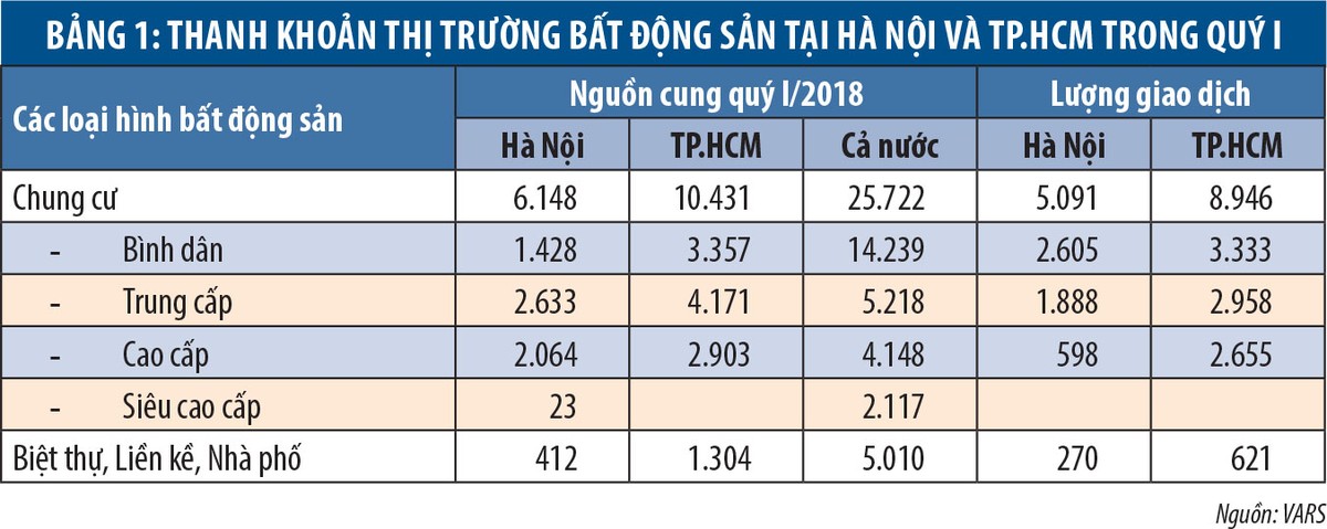 Hầu hết các dự án đất nền được quy hoạch quy củ, bài bản, xây dựng cơ sở hạ tầng tốt đều có mức thanh khoản tốt với tỷ lệ hấp thụ từ 80 - 85% trong một thời gian ngắn. Tại Hà Nội, quý I/2018 ghi nhận giao dịch sôi động ở phân khúc nhà ở liền kề. Bắt đầu có làn sóng chuyển từ việc lựa chọn chung cư cao cấp sang các dự án có sản phẩm nhà liền kề ở các quận xung quanh vành đai 3 và 3,5 với tổng khối lượng giao dịch trên toàn thị trường sơ cấp khoảng 930 căn.
