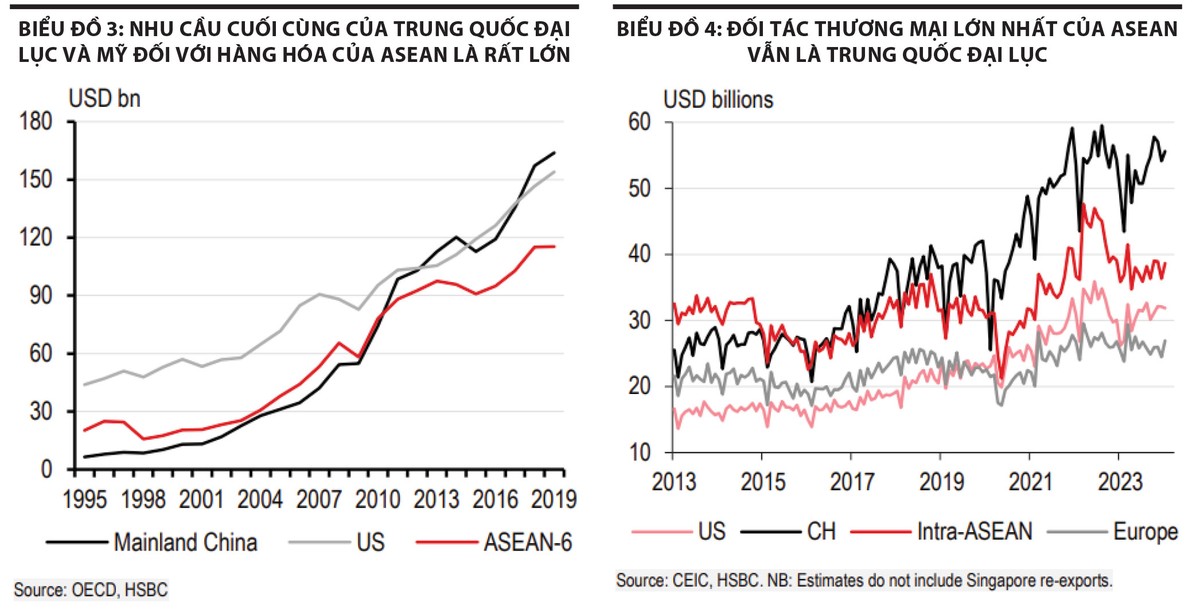 Mặc dù ASEAN là điểm đến xuất khẩu lớn nhất của bản thân khối này, nhưng lại không phải đối tác thương mại lớn nhất của chính nó, mà chính là Trung Quốc đại lục với khối lượng thương mại mỗi tháng gần đây cao hơn ASEAN 20 tỷ USD (Biểu đồ 4). Đông Nam Á tiếp tục nhập khẩu một phần lớn từ Trung Quốc đại lục, trở thành khách hàng chính của nền kinh tế lớn thứ 2 thế giới đối với hàng hóa cuối cùng và là trung tâm sản xuất bên ngoài của Trung Quốc đại lục. Kết nối giữa Trung Quốc và ASEAN cũng ăn sâu vào kết cấu kinh tế của khu vực này, vì vậy bất kỳ sự suy giảm nào xảy ra ở Trung Quốc đại lục cũng ảnh hưởng đến mỗi nền kinh tế Đông Nam Á. (Biểu đồ 3 và 4)