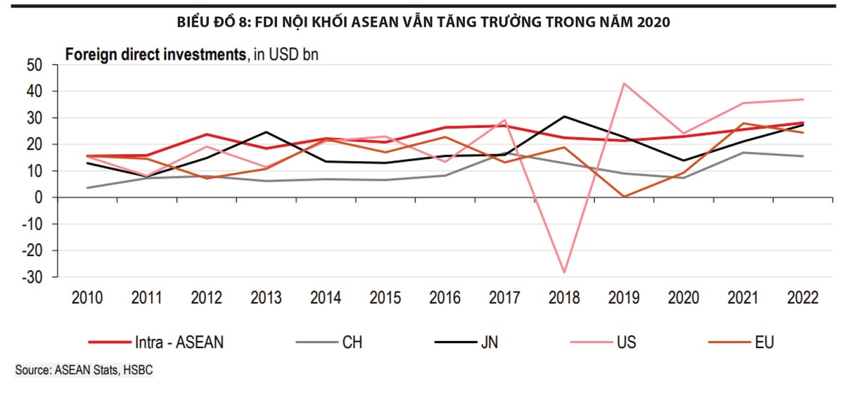 Tuy nhiên, khi ASEAN ngày càng phát triển theo chiều hướng đi lên, tự xây dựng được các công ty đẳng cấp thế giới, nhà đầu tư ở Đông Nam Á bắt đầu đầu tư ra bên ngoài nền kinh tế nội địa, hướng sang các nước trong khu vực ASEAN, dẫn đầu là Singapore, Thái Lan và Malaysia. Biểu đồ 7 cho thấy, FDI nội khối ASEAN đứng đầu các nguồn FDI trong phần lớn giai đoạn 2010 - 2019, chỉ gần đây mới bị Mỹ vượt qua. FDI nội khối ASEAN đã trở thành một nguồn vốn ổn định cho ASEAN, nguồn vốn này thậm chí vẫn tăng trưởng trong giai đoạn nặng nề nhất của đại dịch (Biểu đồ 8).