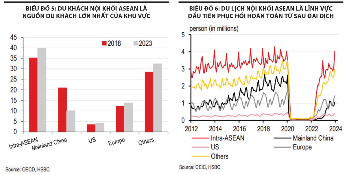 Do đó, khi các nước mở cửa biên giới trở lại, du lịch nội khối ASEAN là lĩnh vực đầu tiên cải thiện (Biểu đồ 6). Trong năm 2022, lĩnh vực này chiếm một nửa lượng du lịch trong khu vực.