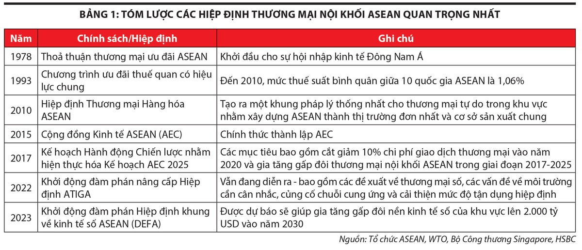 ASEAN được thành lập năm 1967 hướng tới mục tiêu hợp tác kinh tế, xã hội, kỹ thuật và văn hóa. Chậm rãi nhưng chắc chắn, các quốc gia ASEAN đã nhất trí giảm rào cản đối với thương mại nội khối tới mức thấp nhất có thể, với hy vọng giúp ASEAN chuyển mình trở thành một thị trường đơn nhất và cơ sở sản xuất chung. Công cụ chính của kế hoạch này chính là Hiệp định Thương mại Hàng hóa ASEAN (ATIGA) hướng đến gỡ bỏ càng nhiều loại thuế quan càng tốt. Đến năm 2022, 99% hàng hóa có thể giao dịch miễn thuế trong nội khối. Bên cạnh đó là nhiều chính sách, hiệp định khác với mục tiêu là tăng tính tự do thương mại trong nội khối (Bảng 1).