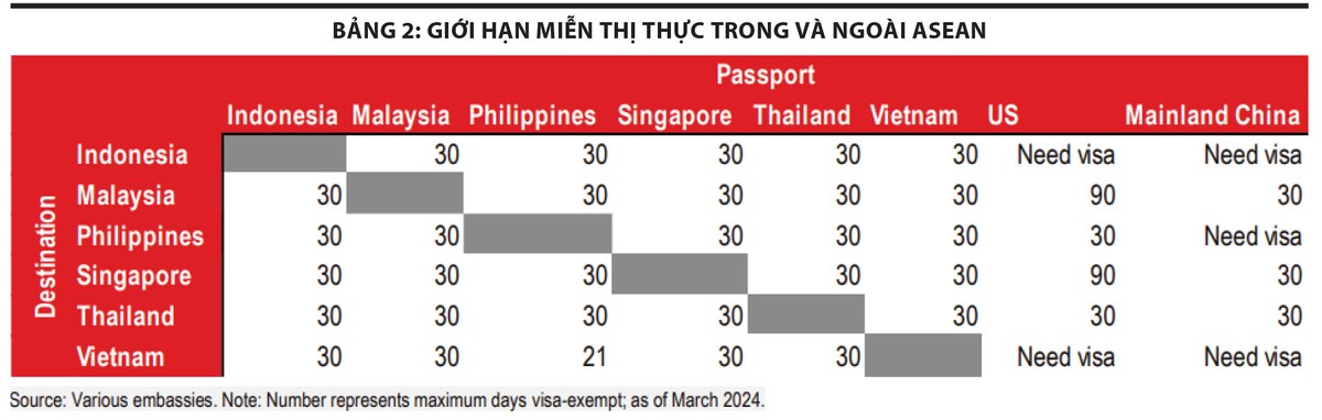 Ngày 25/7/2006, ASEAN đã ký Hiệp định khung ASEAN về miễn thị thực nhằm giúp du khách ASEAN lên kế hoạch cho các kỳ nghỉ thuận tiện hơn. Thông qua hiệp định này, 6 nền kinh tế ASEAN cho phép du khách Đông Nam Á lưu trú 30 ngày miễn thị thực (Bảng 2).