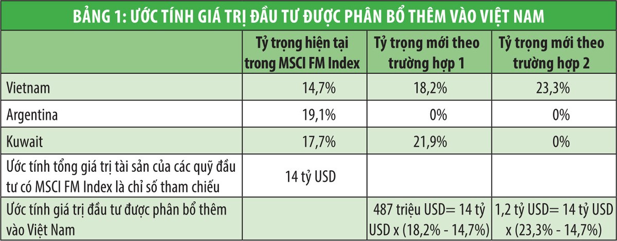 Dựa theo tỷ trọng rổ chỉ số MSCI FM Index tại thời điểm cuối tháng 5/2018 và giả định rằng, tỷ trọng của các thị trường ở lại (bao gồm Việt Nam) tăng lên tương đương theo tỷ trọng hiện có, tỷ trọng của Việt Nam trong MSCI FM Index sẽ tăng từ mức 14,7% hiện tại lên 18,2% trong trường hợp Kuwait không được nâng hạng lên thị trường mới nổi (trường hợp 1) và lên 23,3% trong trường hợp Kuwait được nâng hạng lên thị trường mới nổi (trường hợp 2).