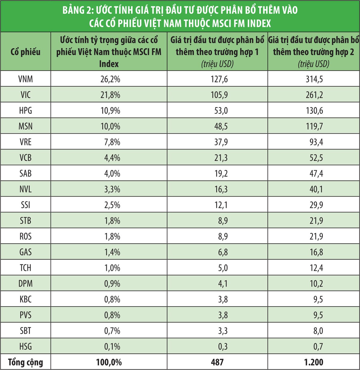 Dòng vốn mới sẽ dần tiến vào Việt Nam trong 2 - 3 năm tới khi các quỹ đầu tư tiến hành điều chỉnh danh mục theo tỷ trọng mới của MSCI FM Index. Điều này sẽ dẫn đến việc các cổ phiếu Việt Nam thuộc rổ chỉ số MSCI FM Index nhận được lượng đầu tư lớn mới từ nước ngoài, đặc biệt là các cổ phiếu vốn hóa lớn như VNM, VIC, HPG, MSN, VRE, VCB, SAB (xem Bảng 2).