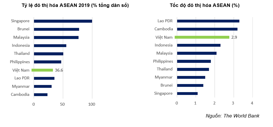 Tốc độ tăng trưởng đô thị hóa Việt Nam năm 2019 đạt 2,9% tương đối nhanh trong khu vực. Trong 10 năm tới, World Bank dự báo dân số đô thị Việt Nam dự phóng tăng trưởng trung bình 2,6%/năm, đứng thứ ba trong các quốc gia ASEAN. Tới năm 2039, sẽ có trên 50% dân số Việt Nam sống tại các đô thị và lên tới 57,3% trong năm 2050.