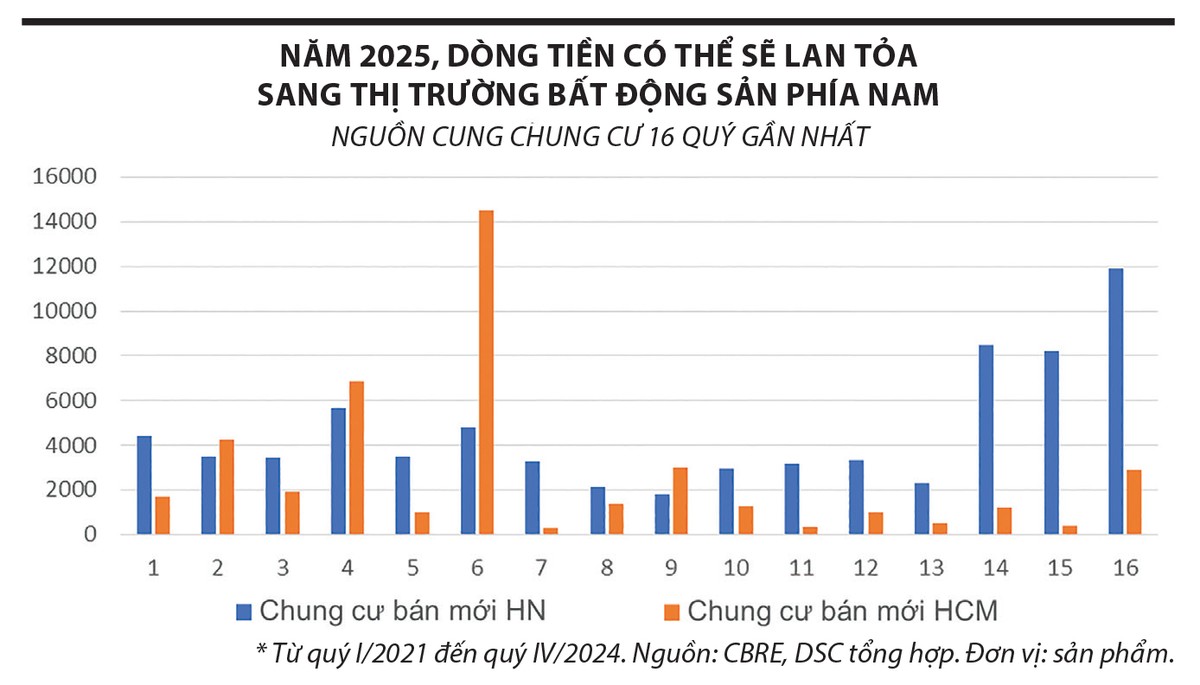 DSC kỳ vọng, tình hình có thể sớm thay đổi, dòng tiền sẽ hướng trở lại phía Nam từ năm 2025, với 4 lý do. Một là, các quy định mới của pháp luật được hướng dẫn và thực thi tại các địa phương, từ đó có phương hướng giải quyết khoảng 70% dự án đang vướng mắc. Hai là, giá bất động sản phía Nam đang khá hợp lý sau khoảng thời gian chững lại. Ba là, các nhà phát triển uy tín “ra hàng” trở lại giúp nguồn cung đa dạng, nhiều sự lựa chọn.