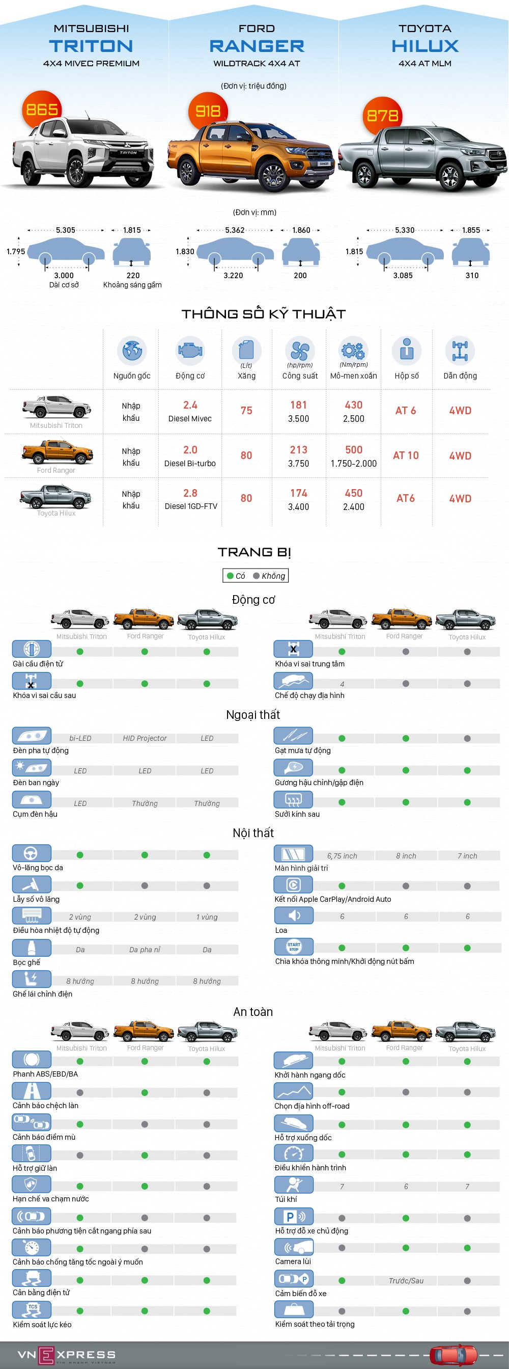 Theo Vnexpress Tin liên quan Xe bán tải Hyundai có thể đấu Ford Ranger Raptor 16/09/2019 14:39 RT1: xe bán tải chạy bằng điện dành cho phượt thủ 28/10/2019 16:20 Xe bán tải tăng phí trước bạ, đại lý “tung chiêu” khuyến mại tiền mặt để kéo khách 05/04/2019 08:52 Từ khóa Triton Ranger Hilux xe bán tải dòng xe bán tải