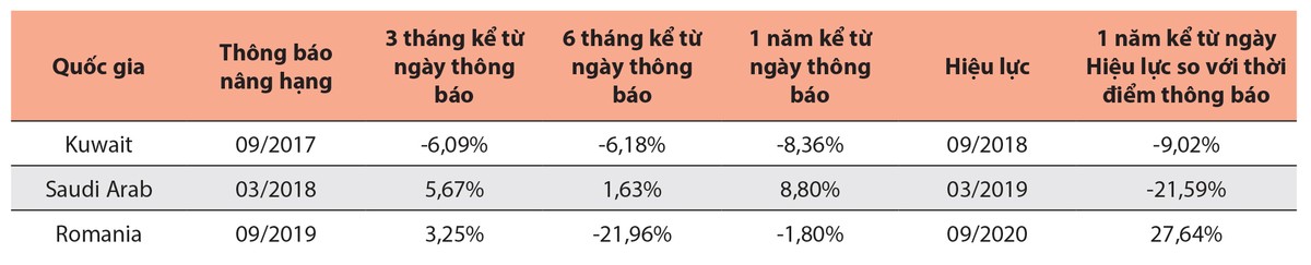 Hiệu ứng nâng hạng thị trường chứng khoán luôn được nhiều nhà đầu tư chú ý, như thống kê của Công ty Chứng khoán Yuanta Việt Nam tại ba thị trường tiêu biểu là Kuwait, Saudi Arab, Romania (xem bảng).