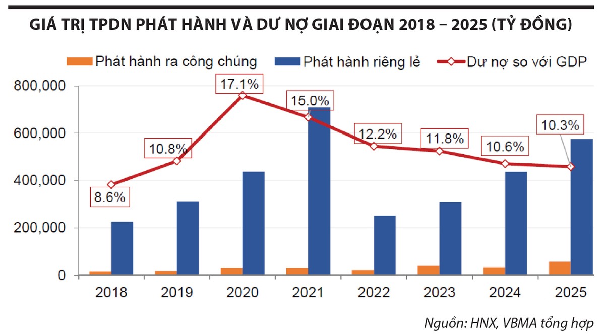 Dữ liệu của Hiệp hội Thị trường trái phiếu Việt Nam cho thấy, thị trường trái phiếu doanh nghiệp đã có sự phục hồi đáng kể về quy mô. Tổng giá trị phát hành trong giai đoạn 2019 - 2025 đạt khoảng 3,23 triệu tỷ đồng, trong khi quy mô thị trường cuối năm 2025 đạt khoảng 1,4 triệu tỷ đồng, tương đương 11 - 12% GDP. Tuy nhiên, nếu đặt trong tương quan với hệ thống tín dụng ngân hàng, quy mô này vẫn còn khiêm tốn và cho thấy thị trường chưa thực sự trở thành kênh dẫn vốn trung dài hạn đủ mạnh.