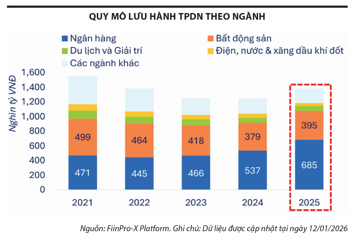 Dù vậy, năm 2025 đánh dấu bước phục hồi quan trọng của thị trường trái phiếu doanh nghiệp. Theo FiinRatings, tổng giá trị phát hành trái phiếu doanh nghiệp cả năm 2025 đạt 644.100 tỷ đồng, tăng 35,4% so với năm 2024, trong đó phát hành ra công chúng tăng tới 52,4%, phản ánh sự cải thiện về niềm tin thị trường và mức độ tuân thủ pháp lý. Dư nợ toàn thị trường đạt hơn 1.383.000 tỷ đồng, tăng 10,9% so với cuối năm 2024, đảo chiều sau ba năm thu hẹp liên tiếp. Tuy nhiên, ngân hàng vẫn chiếm 66% tổng giá trị phát hành với 425.800 tỷ đồng - một cơ cấu phản ánh sự phụ thuộc còn lớn vào một nhóm tổ chức phát hành duy nhất.