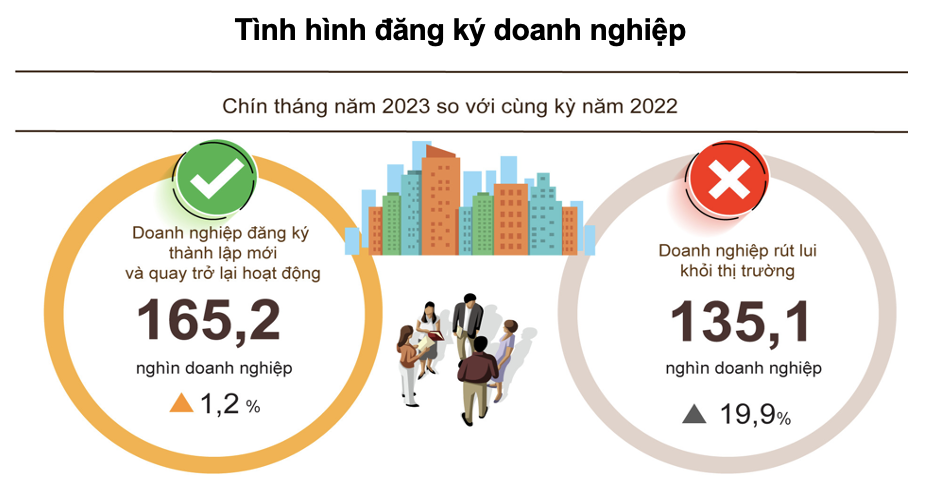 Bên cạnh đó, có 48.900 doanh nghiệp quay trở lại hoạt động, giảm 3,2% so với 9 tháng năm 2022, nâng tổng số doanh nghiệp thành lập mới và doanh nghiệp quay trở lại hoạt động trong 9 tháng lên 165.200 doanh nghiệp, tăng 1,2% so với cùng kỳ năm trước.