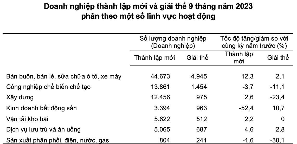 Tính chung 9 tháng, số doanh nghiệp tạm ngừng kinh doanh có thời hạn là 75.800 doanh nghiệp, tăng 21,2% so với cùng kỳ năm trước; 46.100 doanh nghiệp ngừng hoạt động chờ làm thủ tục giải thể, tăng 26,9%; 13.200 doanh nghiệp hoàn tất thủ tục giải thể, giảm 4,3%.