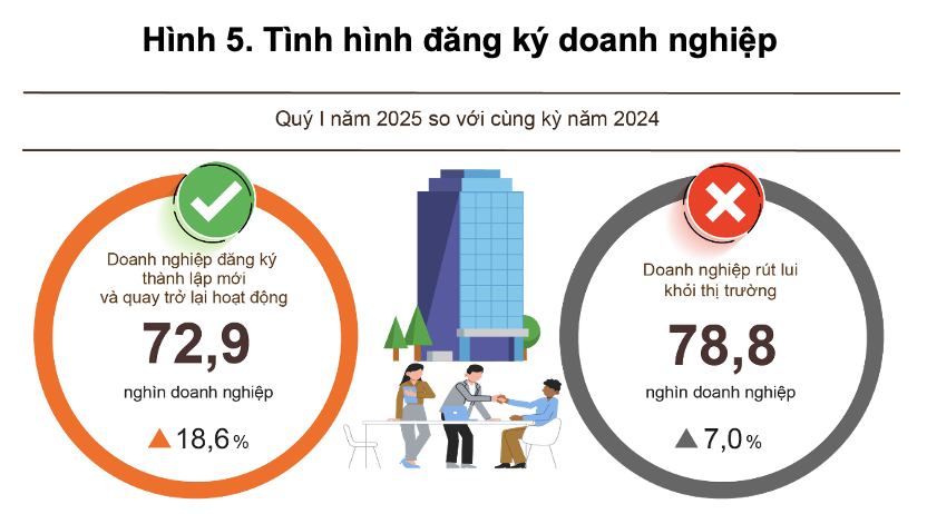 Bên cạnh đó, có 36.500 doanh nghiệp quay trở lại hoạt động, tăng mạnh 54,8% so với cùng kỳ năm 2024. Như vậy, tổng số doanh nghiệp thành lập mới và quay trở lại hoạt động trong quý I/2025 đạt hơn 72.900 doanh nghiệp, tăng 18,6% so với cùng kỳ năm trước. Bình quân mỗi tháng, có hơn 24.300 doanh nghiệp được thành lập mới và quay trở lại hoạt động.