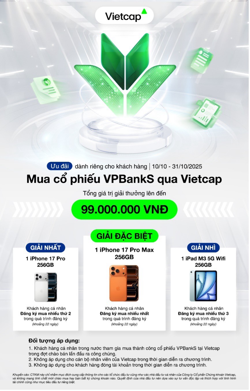 Hôm nay (10/10) là ngày mở bán đầu tiên cổ phiếu VPBankS, Vietcap đồng thời cũng tung loạt khuyến mãi hấp dẫn cho nhà đầu tư đăng ký mua cổ phiếu IPO.