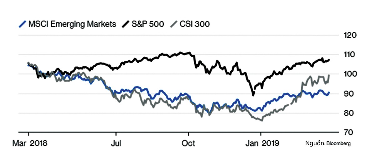 Chỉ số MSCI Các thị trường mới nổi “mờ nhạt” so với màn biểu diễn của S&P 500 (Mỹ) và CSI 300 (Trung Quốc).