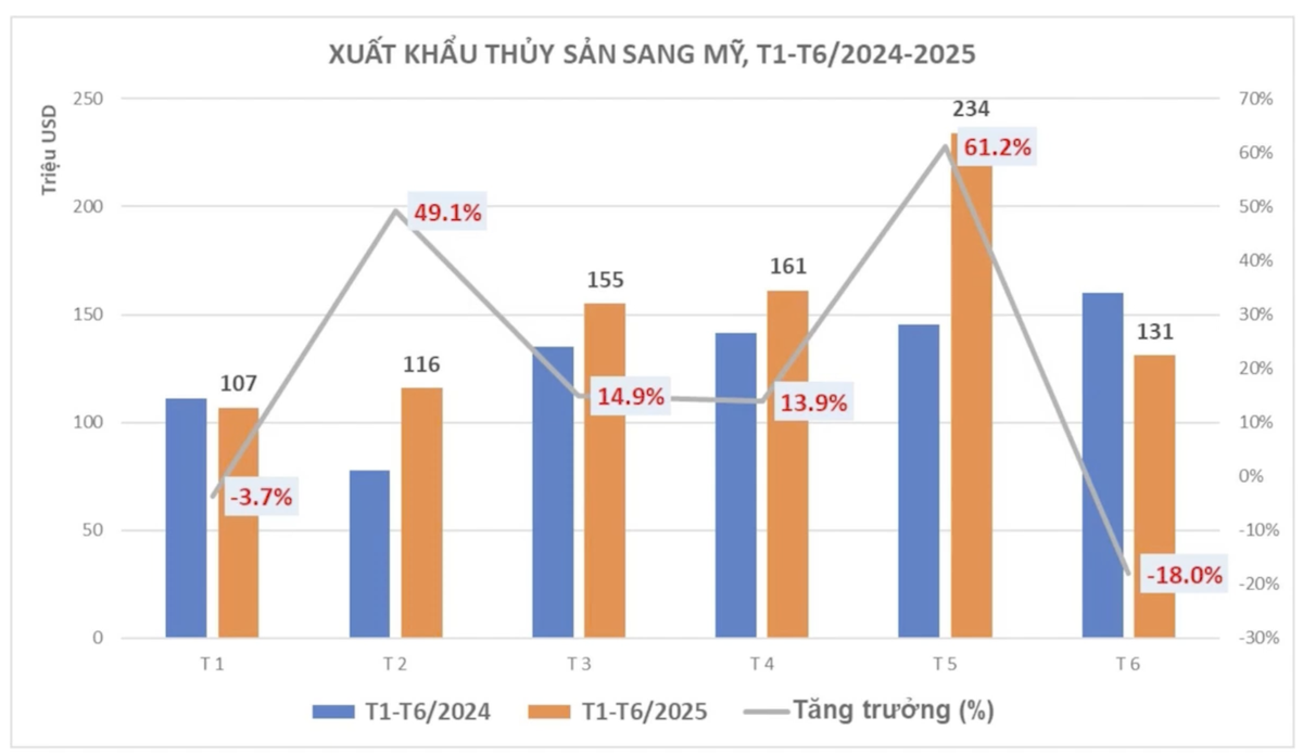 Xét theo từng tháng, xuất khẩu thủy sản sang Mỹ ghi nhận sự tăng trưởng đáng kể trong tháng 3, tháng 4 và đặc biệt là tháng 5/2025 với mức tăng 61% so với cùng kỳ. Đây là tháng có kim ngạch cao nhất trong nửa đầu năm, đạt hơn 234 triệu USD. Tuy nhiên, sang tháng 6, xuất khẩu lại giảm mạnh gần 18% so với cùng kỳ, chỉ còn 131 triệu USD.