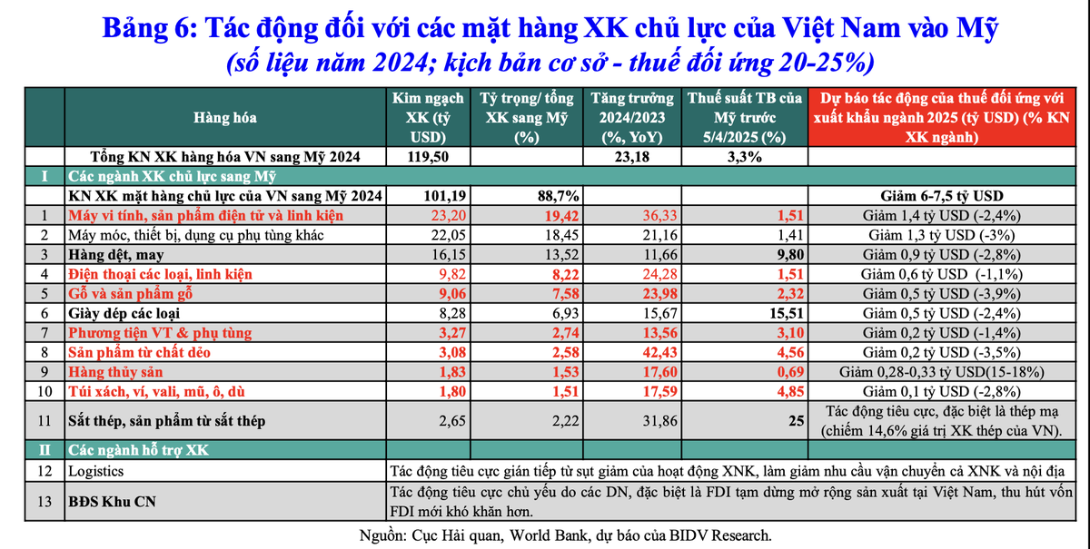 Trong kịch bản cơ sở (60% xác suất xảy ra), Việt Nam thành công trong đàm phán để giảm thuế đối ứng xuống 20 - 25%, dẫn đến kim ngạch xuất khẩu sang Mỹ giảm khoảng 6 - 7,5 tỷ USD so với năm 2024. Trong khi đó, kịch bản tiêu cực hơn (20% xác suất) với mức thuế 46% có thể khiến xuất khẩu giảm tới 22 - 24 tỷ USD. Trong kịch bản tích cực nhất (20% xác suất), Việt Nam chỉ bị áp thuế 10% thì xuất khẩu sẽ không bị ảnh hưởng đáng kể.