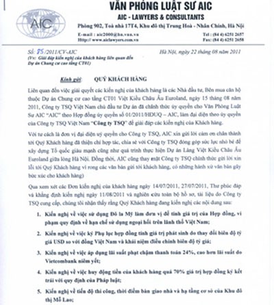 Trong công văn gửi khách hàng vào ngày 22/8/2011, văn phòng luật sư AIC một lần nữa gửi lời xin lỗi về những hành xử văn bản gây bức xúc cho khách hàng” trong thời gian qua đồng thời, phúc đáp về tất cả các kiến nghị mà khách hàng mua căn hộ tại dự dán làng Việt kiều châu Âu quan tâm.