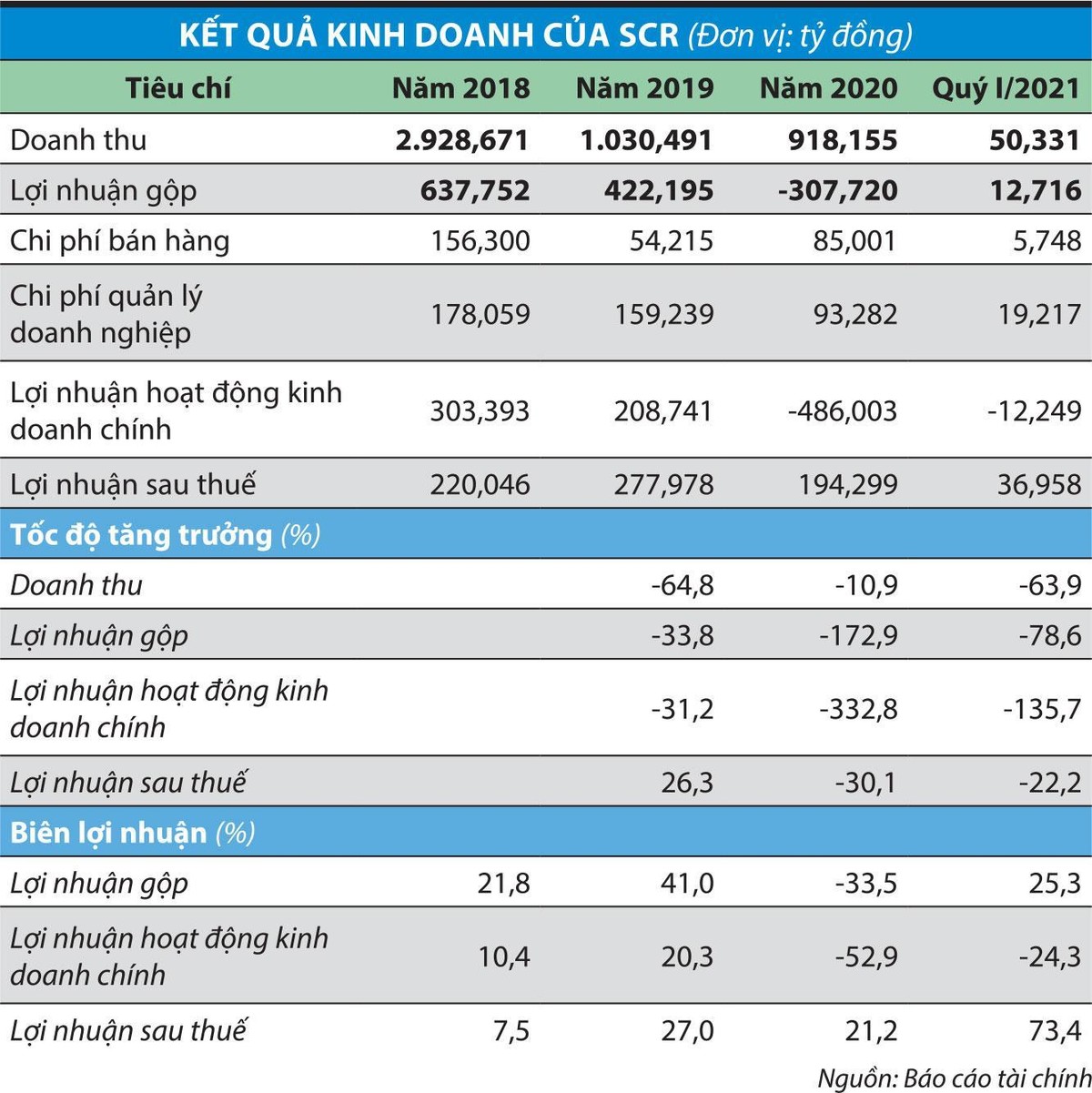 Trước đó, trong năm 2020, SCR kinh doanh dưới giá vốn, lợi nhuận gộp âm 307,7 tỷ đồng, lợi nhuận hoạt động kinh doanh chính âm 486 tỷ đồng. Doanh nghiệp chỉ thoát lỗ nhờ doanh thu tài chính tăng 3 lần, lên 850,1 tỷ đồng, chủ yếu là thu nhập tài chính từ thanh lý hợp đồng hợp tác đầu tư 143,6 tỷ đồng (cùng kỳ không có), thu nhập từ hoạt động đầu tư tăng 5,7 lần, lên 491,1 tỷ đồng.