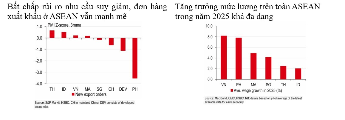Theo HSBC, dù nhu cầu tương lai gần đây đã suy giảm trên toàn cầu, nhưng vẫn đang mạnh mẽ ở ASEAN. Năm trên sáu nền kinh tế ASEAN có chỉ số đơn hàng xuất khẩu mới PMI trong quý cuối năm 2025 cao trên mức bình quân trong quá khứ, ngược lại với tình hình ở Trung Quốc đại lục và các nền kinh tế đã phát triển như Mỹ, Anh và Nhật Bản.
