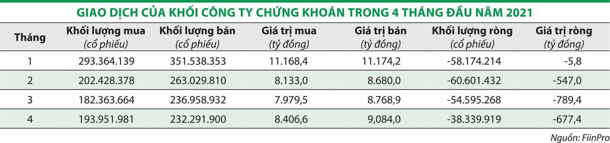 Theo dữ liệu của FiinPro, trong tháng 4/2021, khối tự doanh công ty chứng khoán mua vào 194 triệu cổ phiếu trên sàn HOSE, trị giá 8.406 tỷ đồng, trong khi bán ra 232 triệu cổ phiếu, trị giá 9.084 tỷ đồng; khối lượng bán ròng là 38,3 triệu cổ phiếu, giá trị bán ròng 677,4 tỷ đồng. Tính chung 4 tháng đầu năm 2021, khối tự doanh bán ròng 2.020 tỷ đồng.