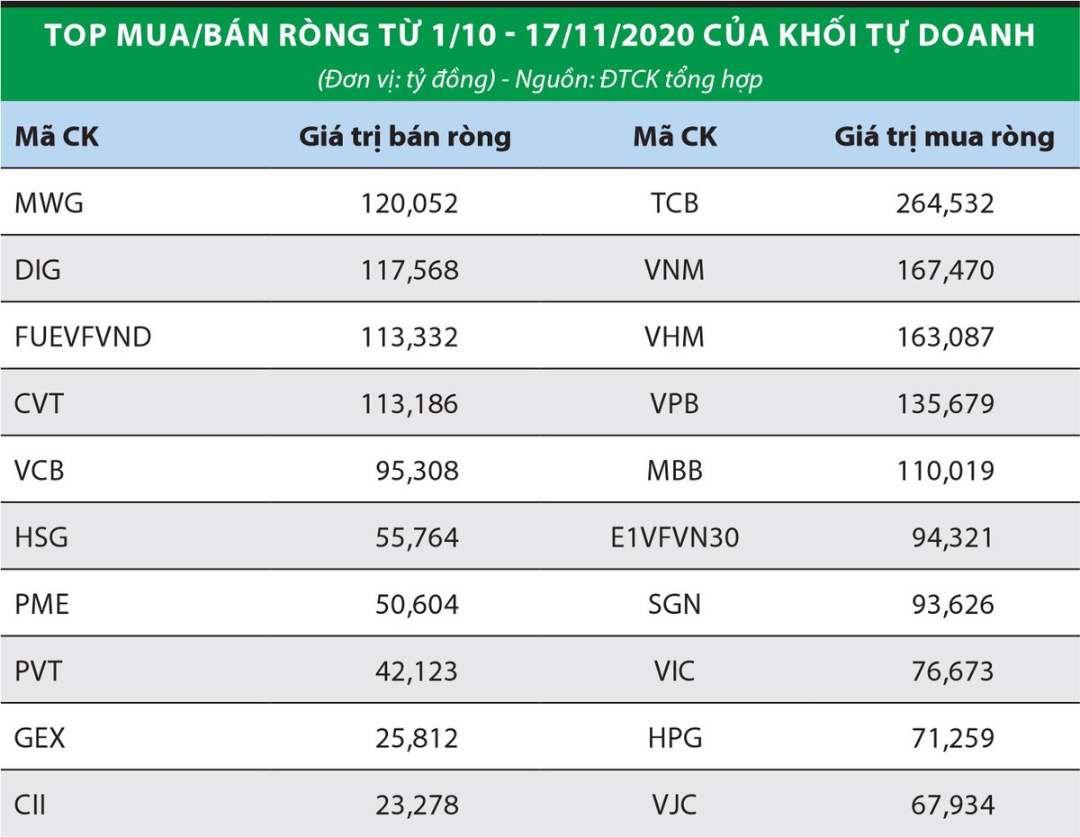 Từ đầu năm đến nay, khối tự doanh có 4 đợt bán ròng lớn. Đợt một vào tháng 4, bán cắt lỗ do thị trường giảm mạnh vì Covid-19, giá trị bán ròng khoảng 1.900 tỷ đồng. Đợt hai là bán phân phối ở đỉnh đợt phục hồi đầu tiên vào tháng 6. Đợt ba vào thời điểm VN-Index kiểm tra ngưỡng kháng cự 900 điểm trong tháng 9 (giá trị bán ròng 726 tỷ đồng). Đợt bốn từ tuần thứ 2 của tháng 11, khi chỉ số kiểm tra vùng kháng cự mới quanh 970 điểm.