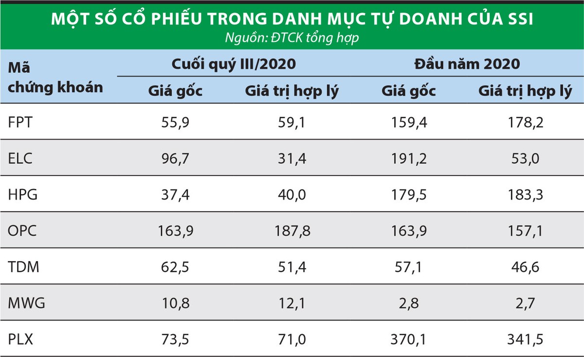Tự doanh đầu tư truyền thống điển hình là Công ty Chứng khoán SSI. Công ty này có Công ty quản lý quỹ SSI (SSIAM) nên danh mục tính đến cuối quý III/2020 vẫn theo hướng đầu tư tài chính truyền thống, với các mã cổ phiếu cơ bản quen thuộc như FPT, HPG, MWG, PLX… Trước đó, trong quý II, SSI đã chốt lời cổ phiếu DBC khi giá tăng mạnh.