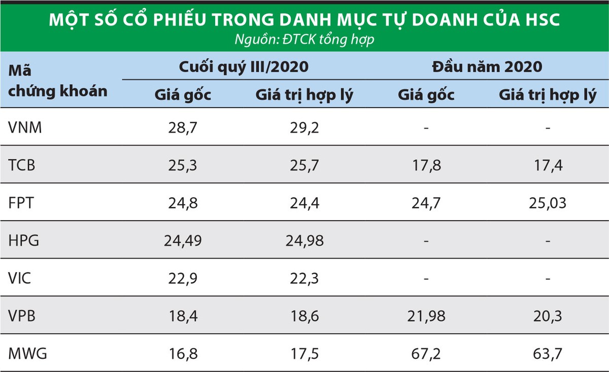 Trong khi đó, một số công ty chứng khoán khác chọn hoạt động tự doanh chủ yếu để tạo lập sản phẩm mới. Chẳng hạn, Công ty Chứng khoán TP.HCM (HSC) tạo lập cho E1VFVN30 (quỹ ETF mô phỏng chỉ số VN30) và FUEVFVND (quỹ ETF mô phỏng chỉ số VN Diamond), nên danh mục tự doanh của Công ty dàn trải theo các mã trong VN30 và số dư không quá lớn, đủ để đáp ứng các nghiệp vụ với khách hàng.