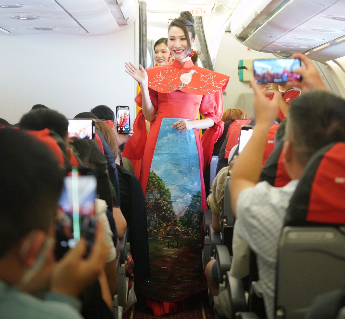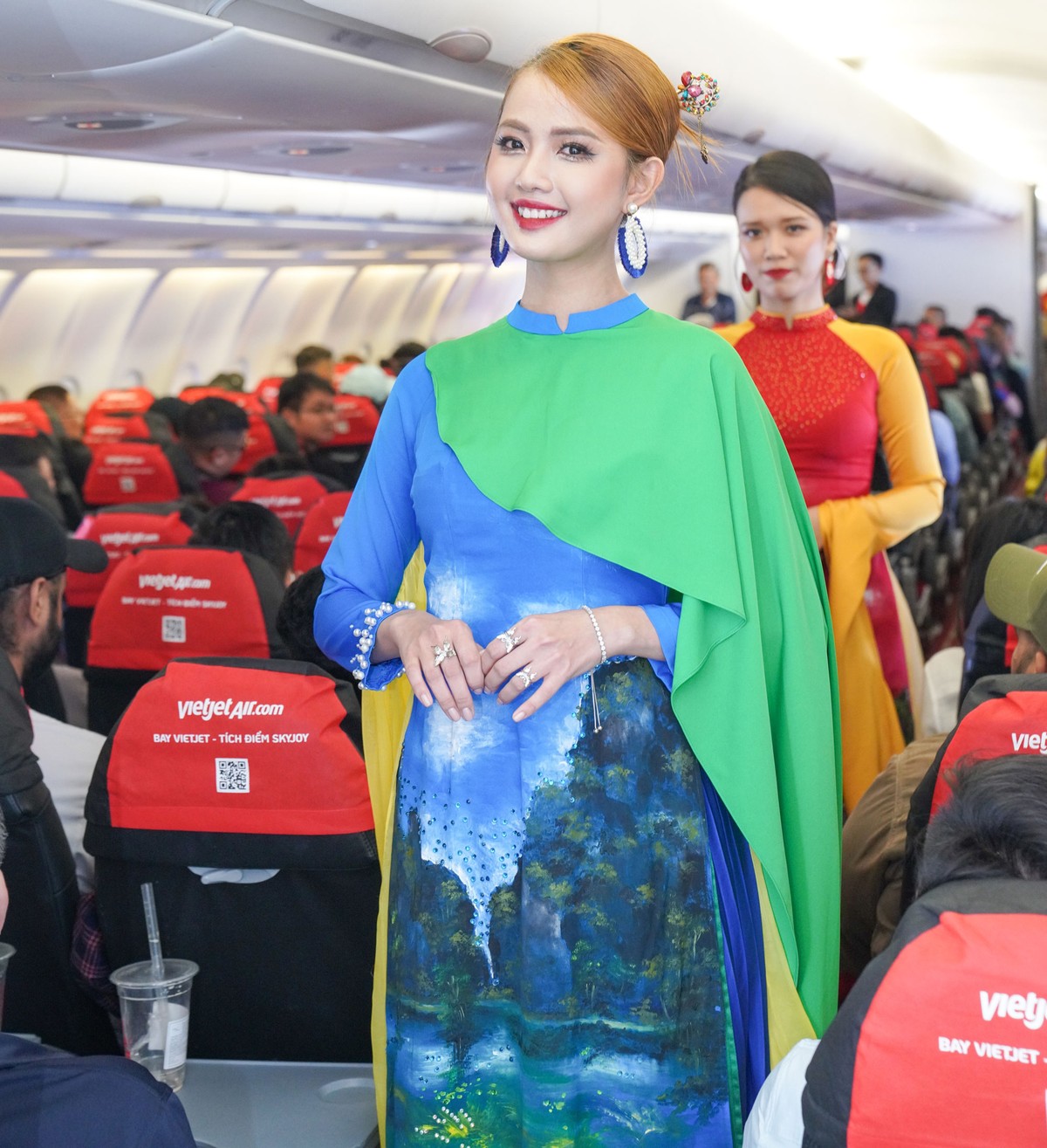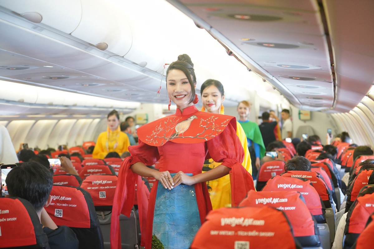 Trên độ cao 10.000m, hành khách đã bất ngờ trở thành khán giả của một màn trình diễn trang phục dân tộc áo dài chào mừng ngày Quốc khánh của các tiếp viên hàng không Vietjet. Những họa tiết độc đáo được lấy cảm hứng từ các địa danh lịch sử, danh lam thắng cảnh nổi tiếng của Việt Nam như hồ Gươm, chùa Thiên Mụ, quần thể danh thắng Tràng An, phố cổ Hội An, chợ Bến Thành...