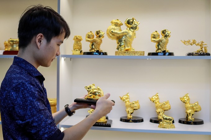 Những ngày này, nhiều tiệm vàng tại TP HCM rục rịch bày bán các loại tượng heo mạ vàng – linh vật của năm Kỷ Hợi.