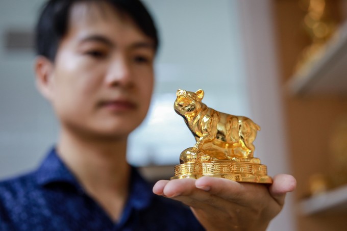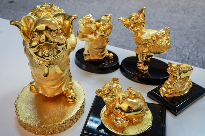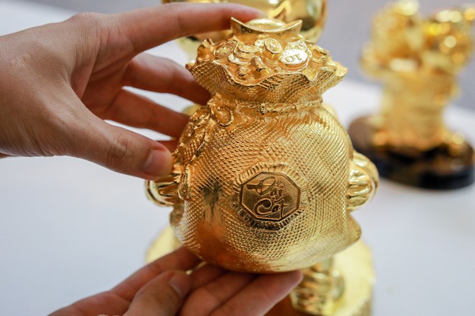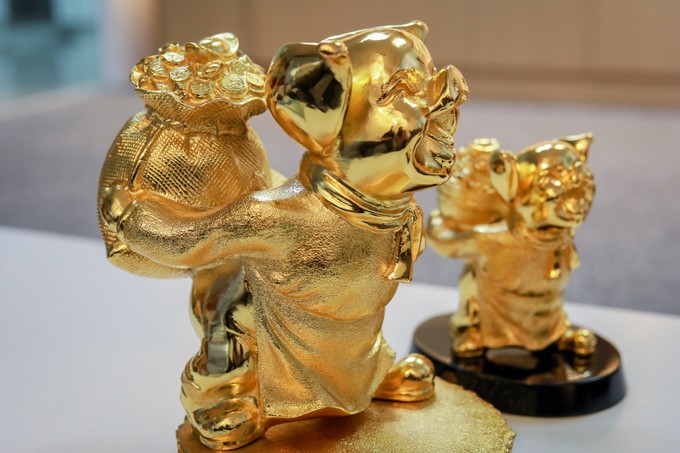 Tượng heo vàng có tên “Được mùa” nặng hơn 5 kg, tượng trưng cho tài lộc dồi dào. Theo ông Trí, sản phẩm này được chế tác giới hạn 188 bản trên toàn thế giới và có giá hơn 146 triệu đồng.