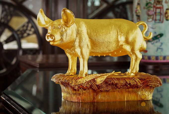 Các chi tiết trên tượng heo được chạm khắc tinh xảo, bề mặt được mạ vàng 24k.