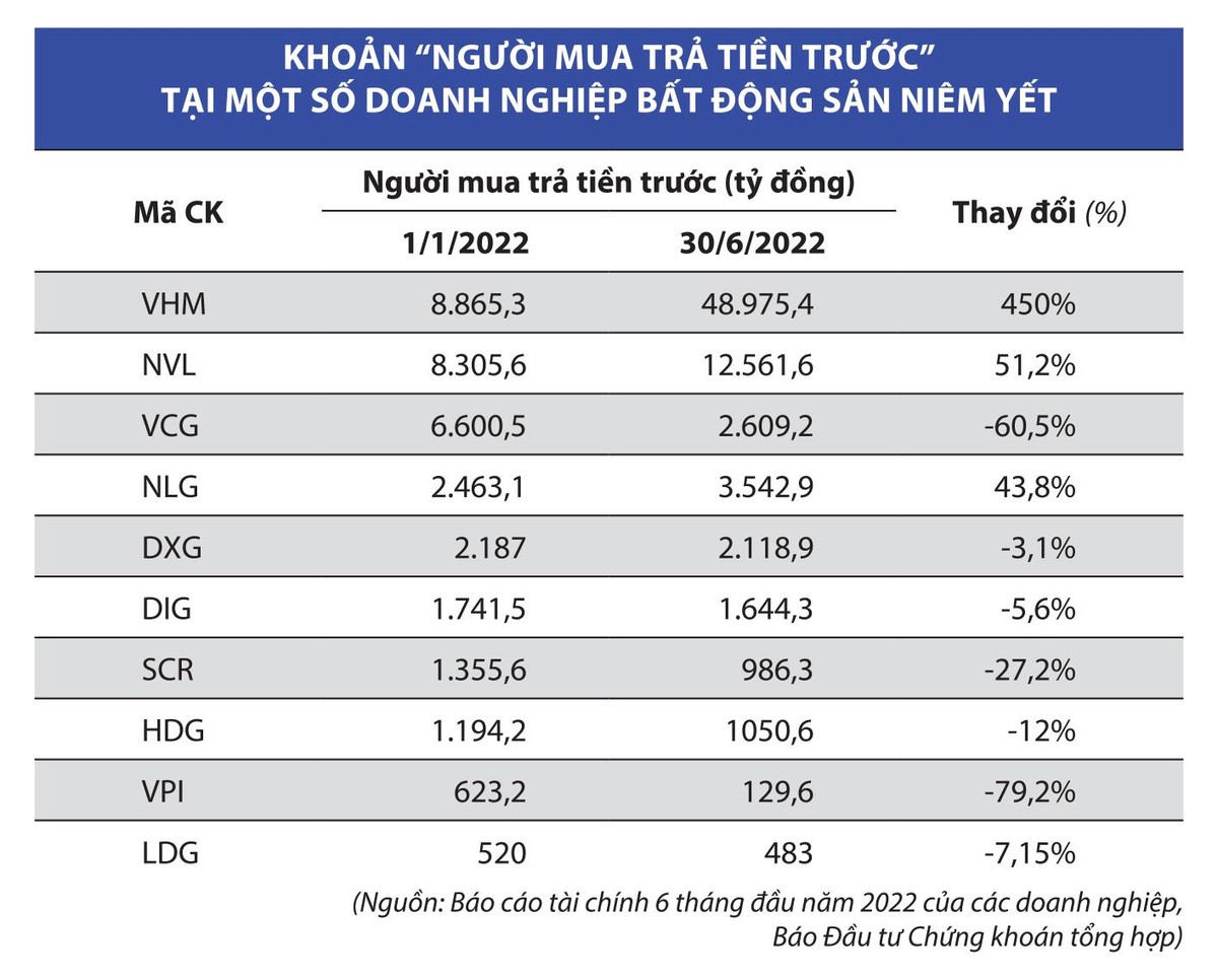 Tuy nhiên, tác động tiêu cực từ những lùm xùm trên thị trường trái phiếu doanh nghiệp khiến việc phát hành mới để đảo vốn cũng như bổ sung vốn cho hoạt động đầu tư phát triển dự án gặp khó khăn, cùng với chủ trương kiểm soát chặt chính sách tiền tệ để kìm chế lạm phát… dẫn đến kỳ vọng bán hàng của doanh nghiệp xuống thấp và điều này phản ánh phần nào qua sự sụt giảm của khoản “người mua trả tiền trước”.