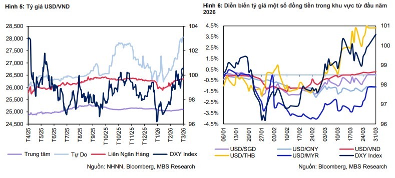 Trong nước, Nghiên cứu của MBS cho biết, dưới tác động của USD mạnh lên, tỷ giá tiếp tục tăng nhanh trong tháng 3. Cụ thể, tỷ giá liên ngân hàng đến cuối tháng tăng 1,1% so với tháng trước, lên 26.345 VND/USD (tăng 0,3% so với đầu năm). Tỷ giá trung tâm tăng nhẹ 0,2% lên 25.102 VND/USD (giảm 0,1% so với đầu năm), trong khi tỷ giá tự do tăng mạnh 5,1%, lên mức 28.055 VND/USD - thiết lập đỉnh lịch sử mới (tăng 4,2% so với đầu năm).