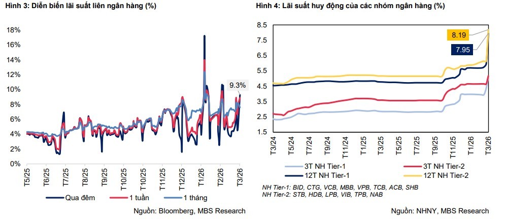 “Đáng chú ý, xu hướng tăng lãi suất không chỉ diễn ra ở nhóm ngân hàng quy mô nhỏ mà đã lan sang cả các ngân hàng thương mại lớn, bao gồm nhóm “Big4”. Không chỉ dừng ở biểu lãi suất niêm yết, khảo sát thực tế cho thấy mặt bằng lãi suất tại nhiều ngân hàng cao hơn đáng kể so với mức công bố, thậm chí xuất hiện mức lên tới 9%/năm cho các kỳ hạn từ 6 tháng trở lên”, MBS cho biết.