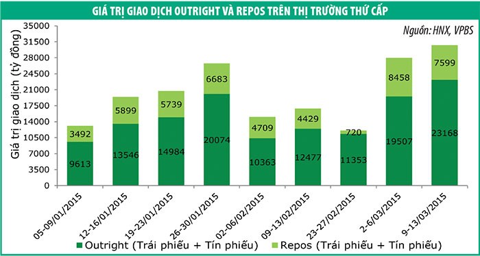 Giá trị thông thường (outright) chiếm 75% tổng giá trị giao dịch (chủ yếu là trái phiếu kỳ hạn 5 năm, chiếm 68%), tương ứng 23.168 tỷ đồng. Khối lượng giao dịch mua bán lại (repos) đạt 7.599 tỷ đồng, chiếm 25% tổng giá trị của thị trường.