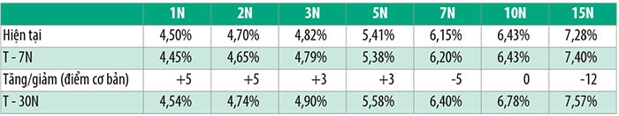 Theo số liệu Bloomberg, lợi suất trái phiếu trong tuần qua thay đổi theo hai xu hướng trái ngược. Trong khi lợi suất dài hạn tiếp tục giảm, lợi suất trái phiếu ngắn hạn lại tăng nhẹ. Riêng lợi suất trái phiếu 10 năm không thay đổi (xem bảng).